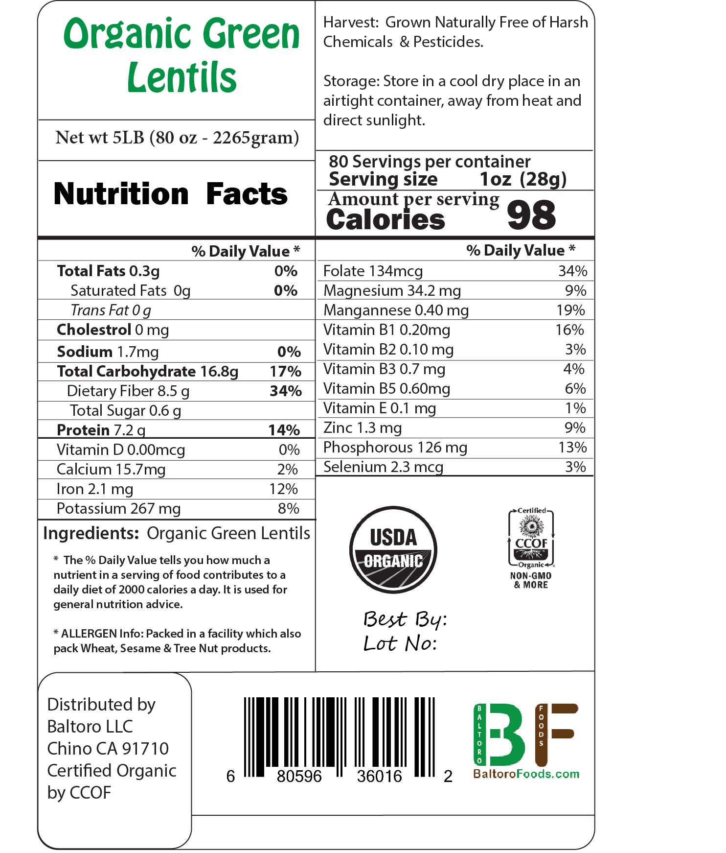 Organic Green Lentils Whole Raw, High Fiber Non-GMO-Bulk